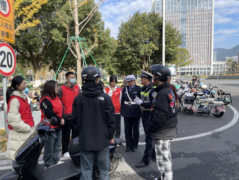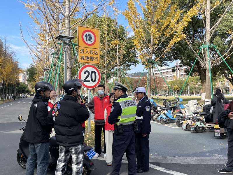 电动自行车是目前大学生最常用的交通工具,但许多学生为了方便,常不佩戴安全头盔、违规载人、逆向行驶等,存在较大安全隐患。为进一步增强我校学生交通安全意识,倡导安全文明出行,有效预防和减少涉校园及学生交通违法和交通事故的发生,2025年12月10日,我校安全保卫部联合交警莲都大队白云中队的交警在校园开展交通违法行为教育劝导行动。