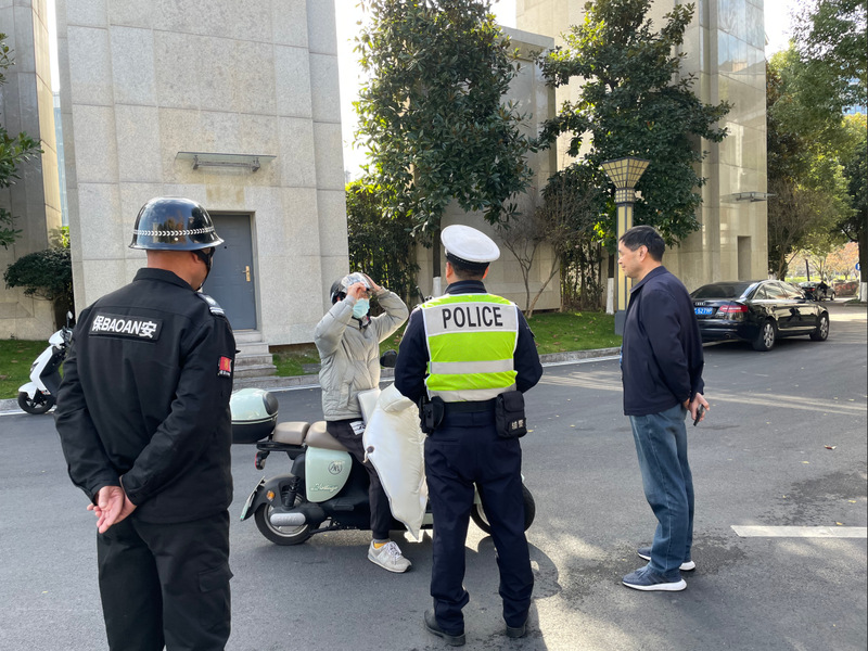 我校安全保卫部工作人员、学生志愿者与交警大队民警组成的联合劝导组,他们对往来电动自行车进行安全检查,重点针对违规载人(搭载12周岁以上人员)、驾乘人员未规范佩戴安全头盔等常见交通违法行为进行现场劝导与教育。
